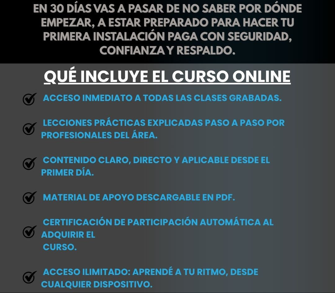 Recomendamos dedicar aproximadamente 30 días para completar todo el curso y estar preparado para tu primera instalación paga, pero podés avanzar a tu propio ritmo.